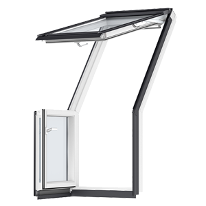 Mit dem VELUX CABRIO™ entsteht im Handumdrehen ein balkonähnlicher Dachaustritt. Der obere Teil des Fensters kann bis 45° aufgeklappt werden, der untere Teil wird herausgedrückt und das Geländer klappt heraus. Treten Sie hinaus und genießen Sie Ihren eigenen kleinen Platz an der Sonne! Der innovative Dachaustritt bringt Licht und Luft in Räume unter Schrägen und sorgt für fantastische Aussicht. In geschlossenem Zustand braucht das VELUX CABRIO™ nicht mehr Platz als ein normales Dachfenster.